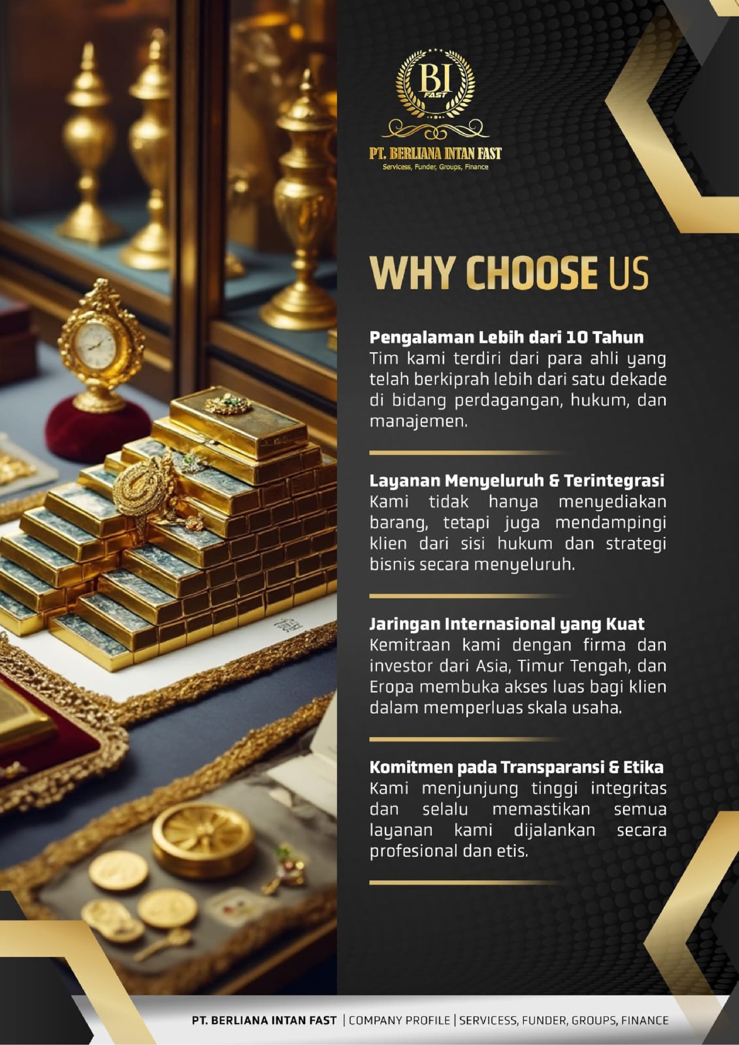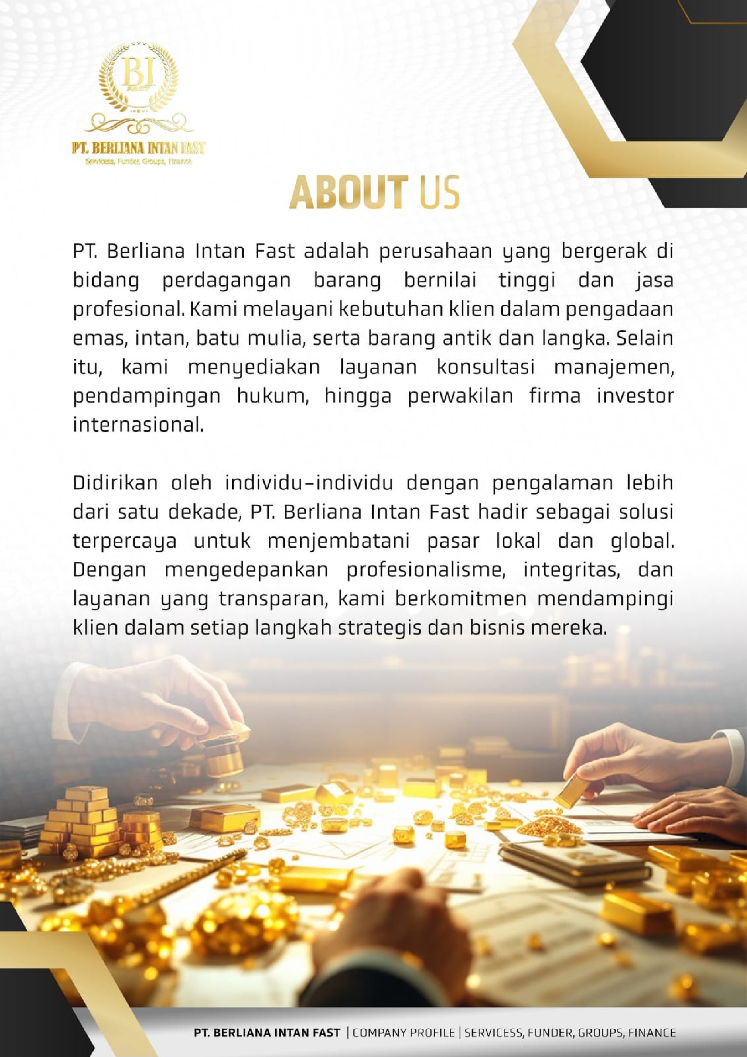 perusahaan yang bergerak di bidang perdagangan barang bernilai tinggi dan jasa profesional. Kami melayani kebutuhan klien dalam pengadaan emas, intan, batu mulia, serta barang antik dan langka.